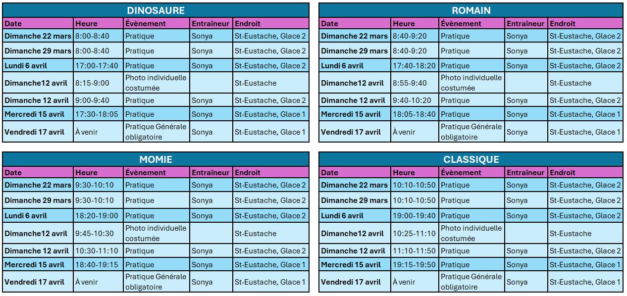 Horaire des pratiques de la Revue sur Glace 2026 :
